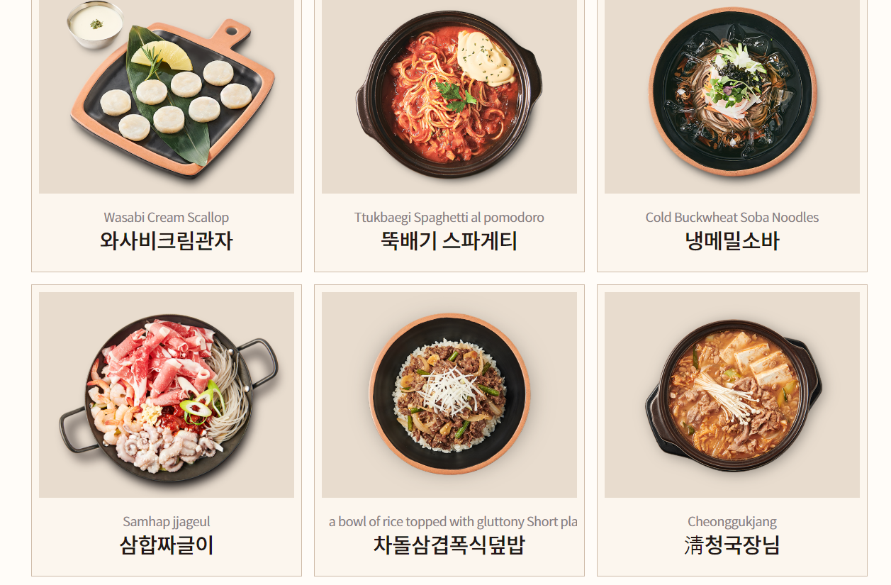 삼합짜글이, 차돌삼겹폭식덮밥, 청국장님이 있어요.